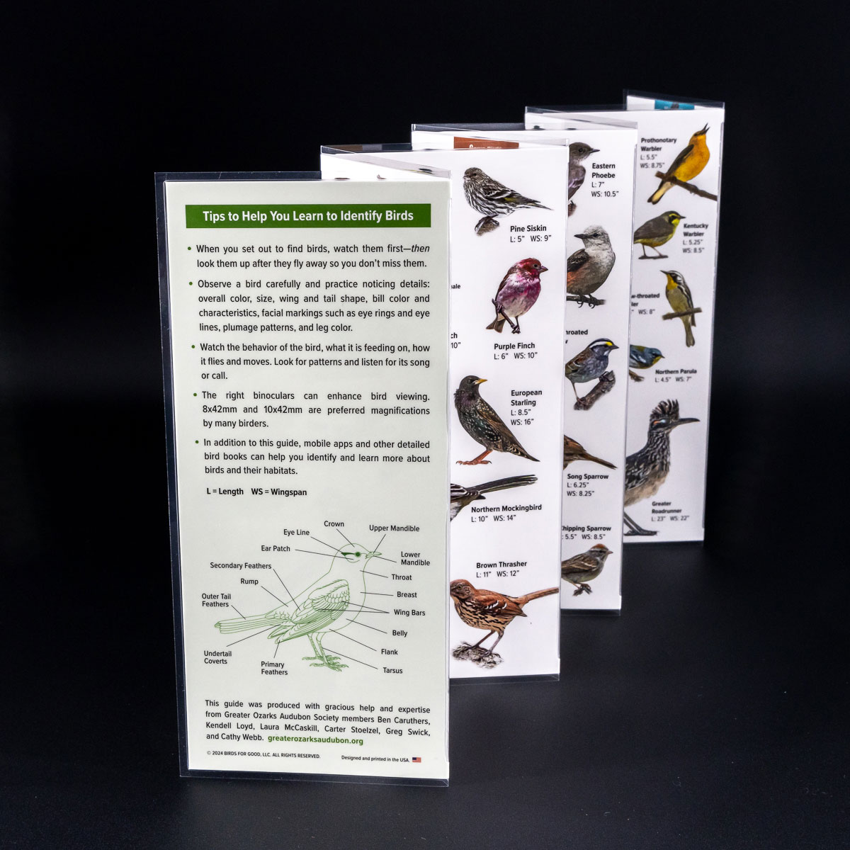 This 16-panel, two sided, laminated guide was developed in collaboration with the Greater Ozarks Audubon Society (GOAS), bird lovers, and experts. It contains visual images of 109 birds commonly seen in the Ozarks region. You can also download the PDF version for free.